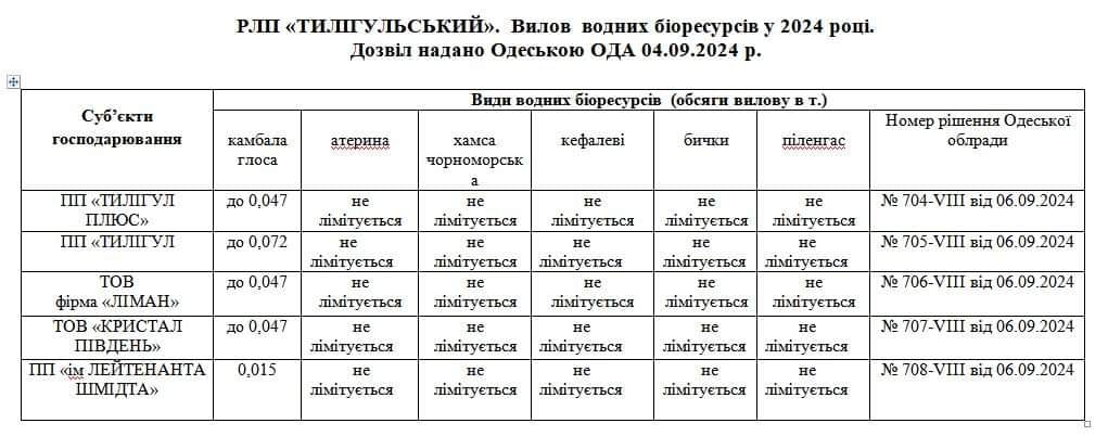 Одеська Обласна Рада надала надала дозвіл промисловикам на БЕЗЛІМІТНИЙ вилов водних біоресурсів (бичок, кефаль, Катерина) на Тилігульському лимані на території РЛП “Тилігульський”.