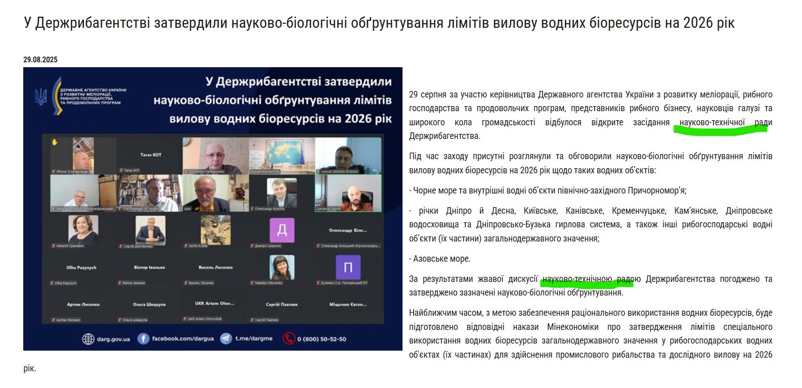 29 серпня у Державному агентстві з розвитку меліорації, рибного господарства та продовольчих програм відбулося засідання, присвячене визначенню лімітів на вилов водних біоресурсів у 2026 році. Здавалося б, звична процедура. Але цього разу сталася подія, яка може мати далекосяжні наслідки для всієї галузі: замість передбаченої законом Науково-промислової ради рішення ухвалювала Науково-технічна рада.